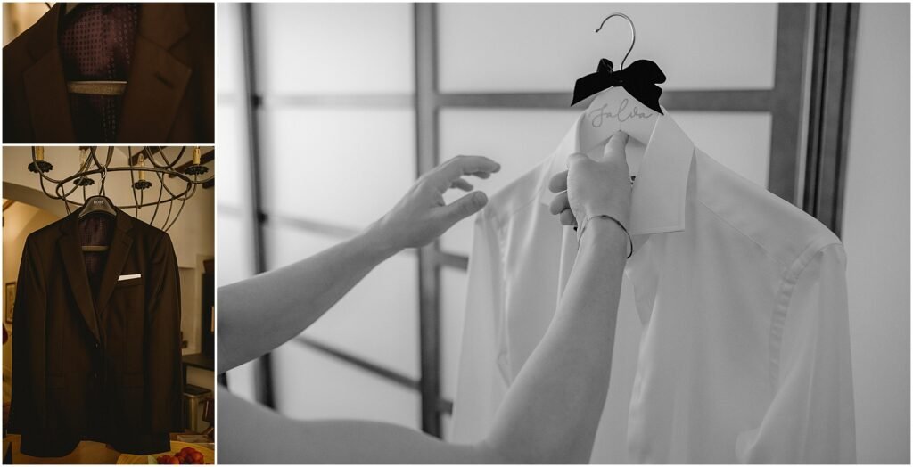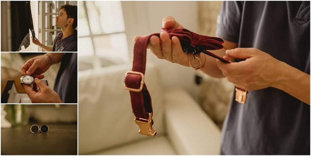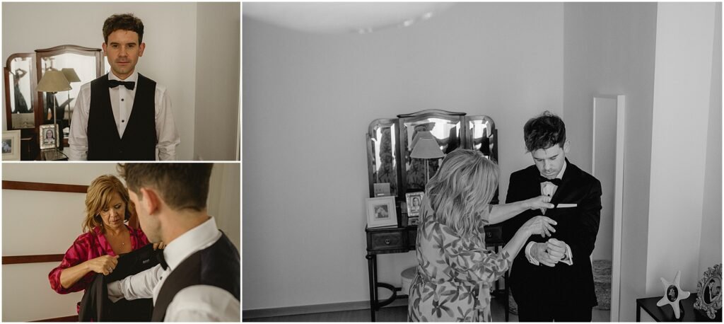El día comenzó en casa de Salva, que estuvo acompañado por su familia. Pasamos con él un ratito haciéndole fotografías con su familia mientras se ponía su elegante traje de novio de Hugo Boss.