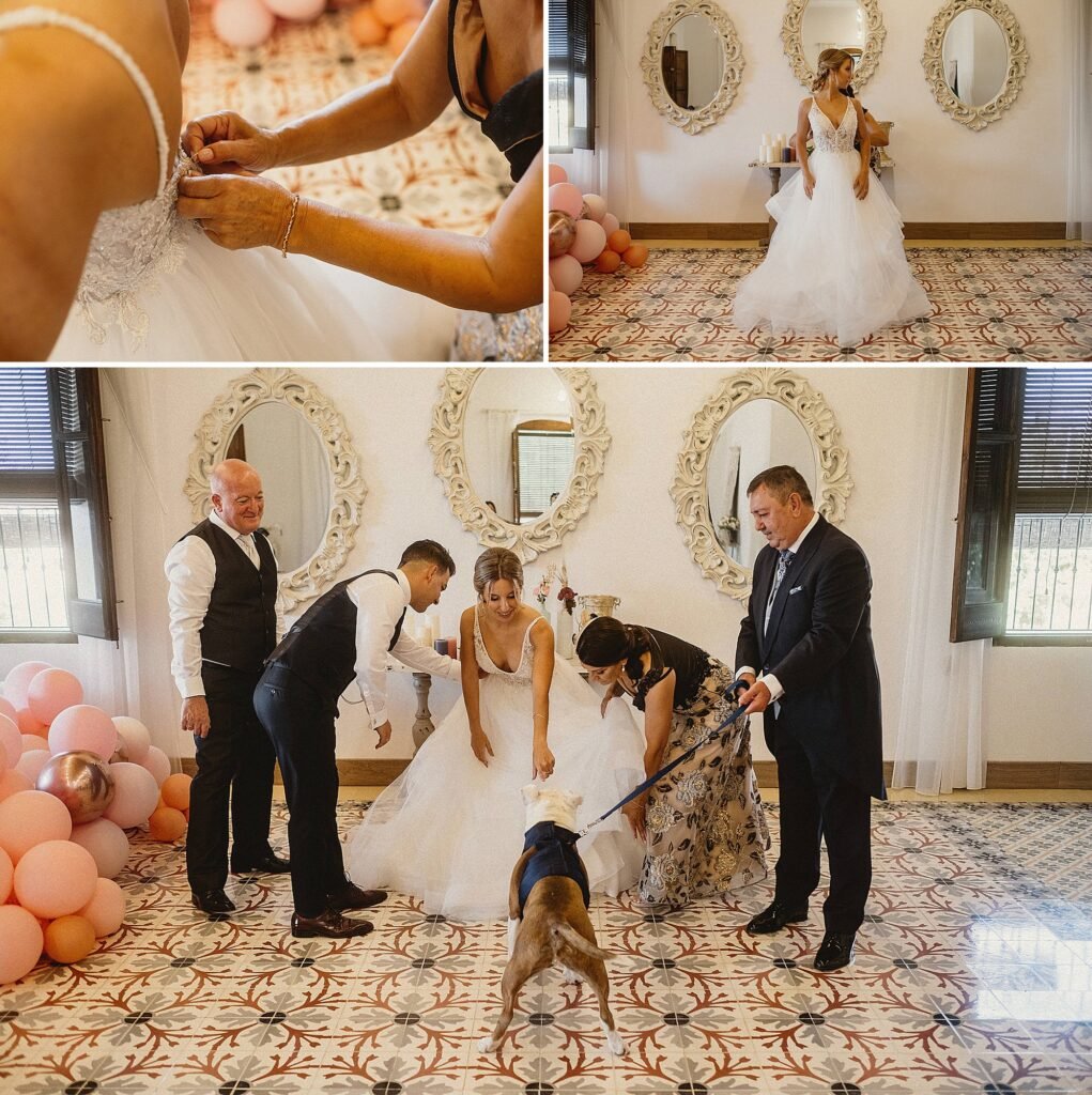 Después fuimos a la Finca Villa María Bonita, ya que Rosi se cambiaba allí. En la parte de arriba, hay una amplia habitación, donde la novia puede cambiarse cómodamente, maquillarse y peinarse si es necesario. En la parte exterior, una gran terraza, que además Rosi aprovechó para tener cómodamente a su perro Kai.
