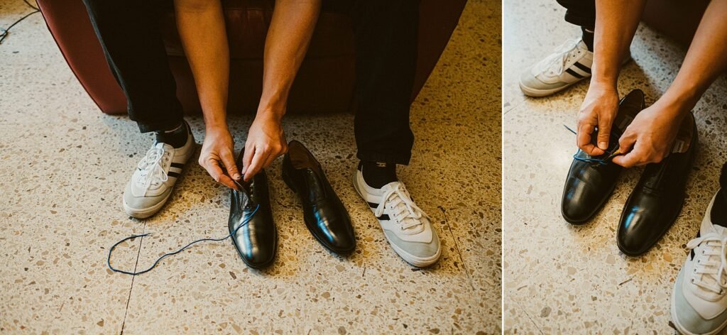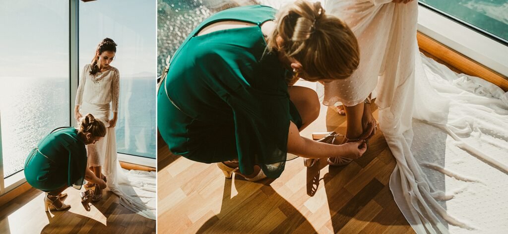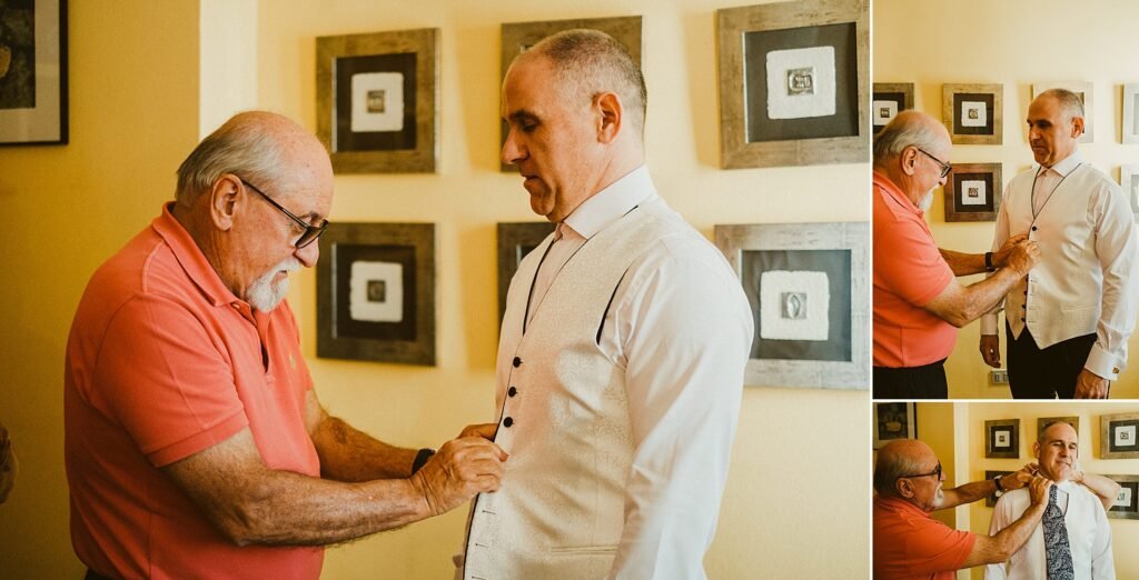 El día comenzó en casa de César. Estuvimos allí con nuestros compañeros de video @ruyro. César estuvo acompañado de sus padres y su tía mientras se arreglaba. Su madre le leyó unas palabras muy emocionantes, tuvimos momentos muy especiales con él. El traje de César era de Enzo Romano Ceremonia. Iba muy elegante y estaba muy muy feliz.