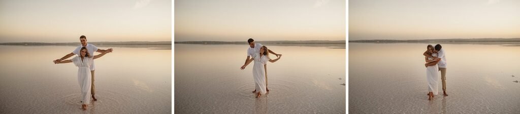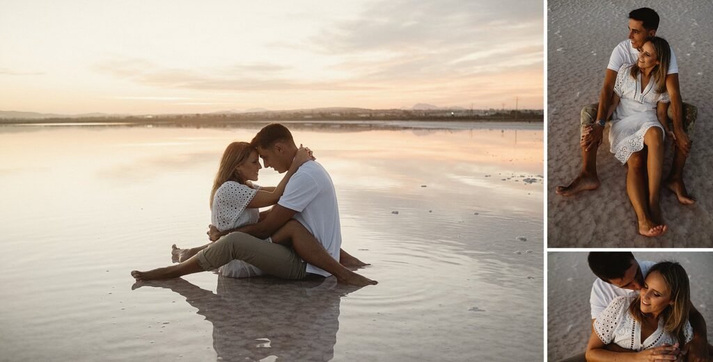 La laguna rosa de Torrevieja es uno de los sitios favoritos de nuestras parejas de Torrevieja para realizar sus reportajes de preboda. Así hicimos con Ana y Héctor. Primero, estuvimos en la zona de calas de Cabo Cervera y después, al atardecer, que es cuándo más bonita está la Laguna rosa, fuimos y terminamos allí su reportaje de preboda.